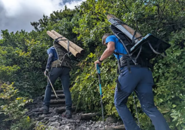 車両や重機が入れない登山道・山頂施設・保全区域などへの資材搬入、物資輸送、設備運搬を担い、山岳地帯における物流のパートナーとしてサポートいたします。これまで培ってきた豊富な現場経験と確かな実績をもとに、公共事業から民間案件まで幅広く対応しております。まずはお気軽にご相談ください。